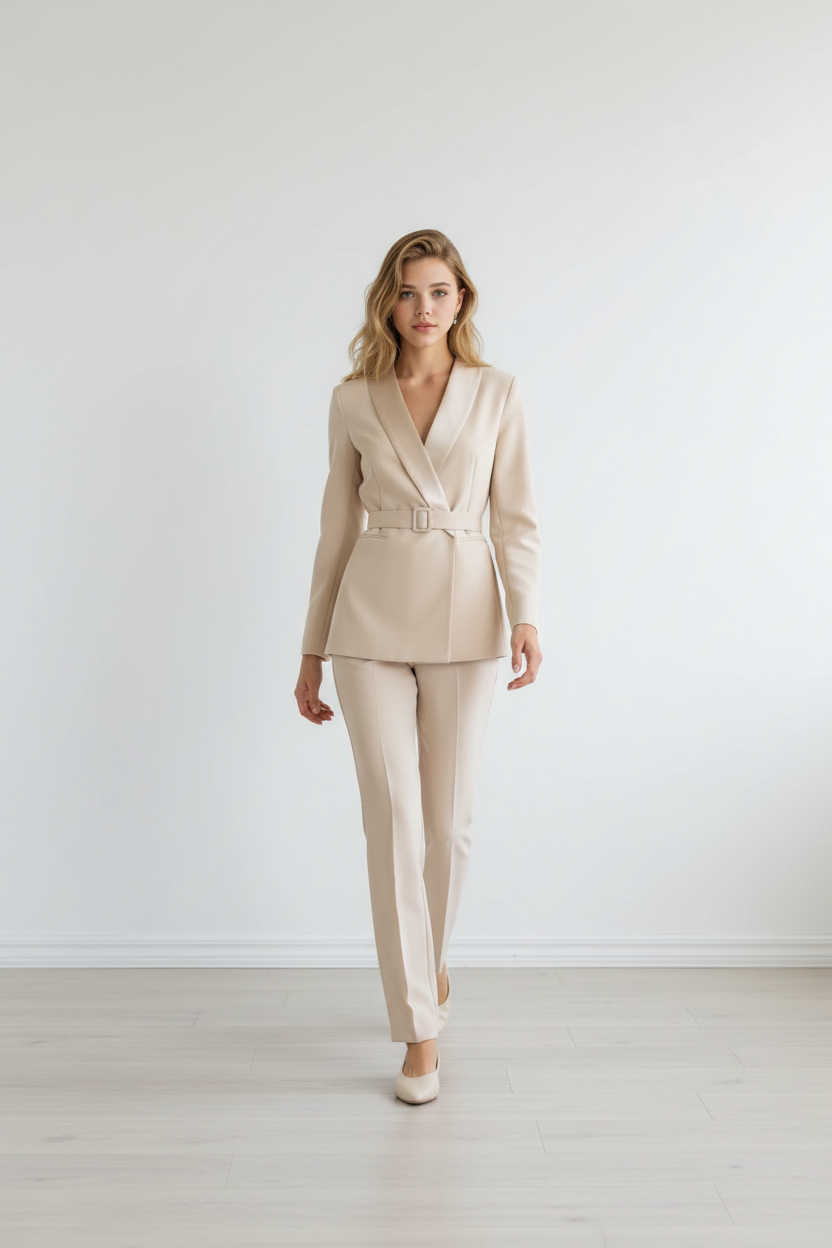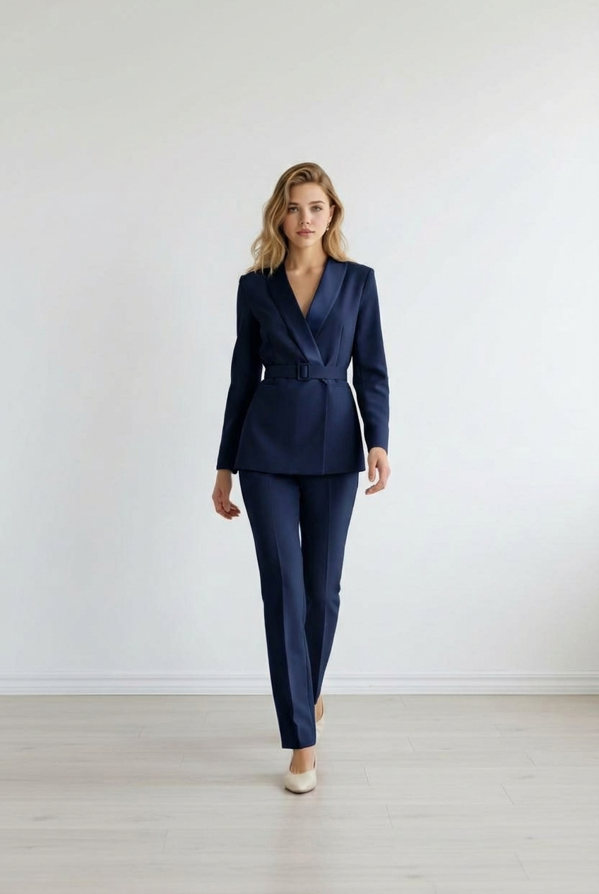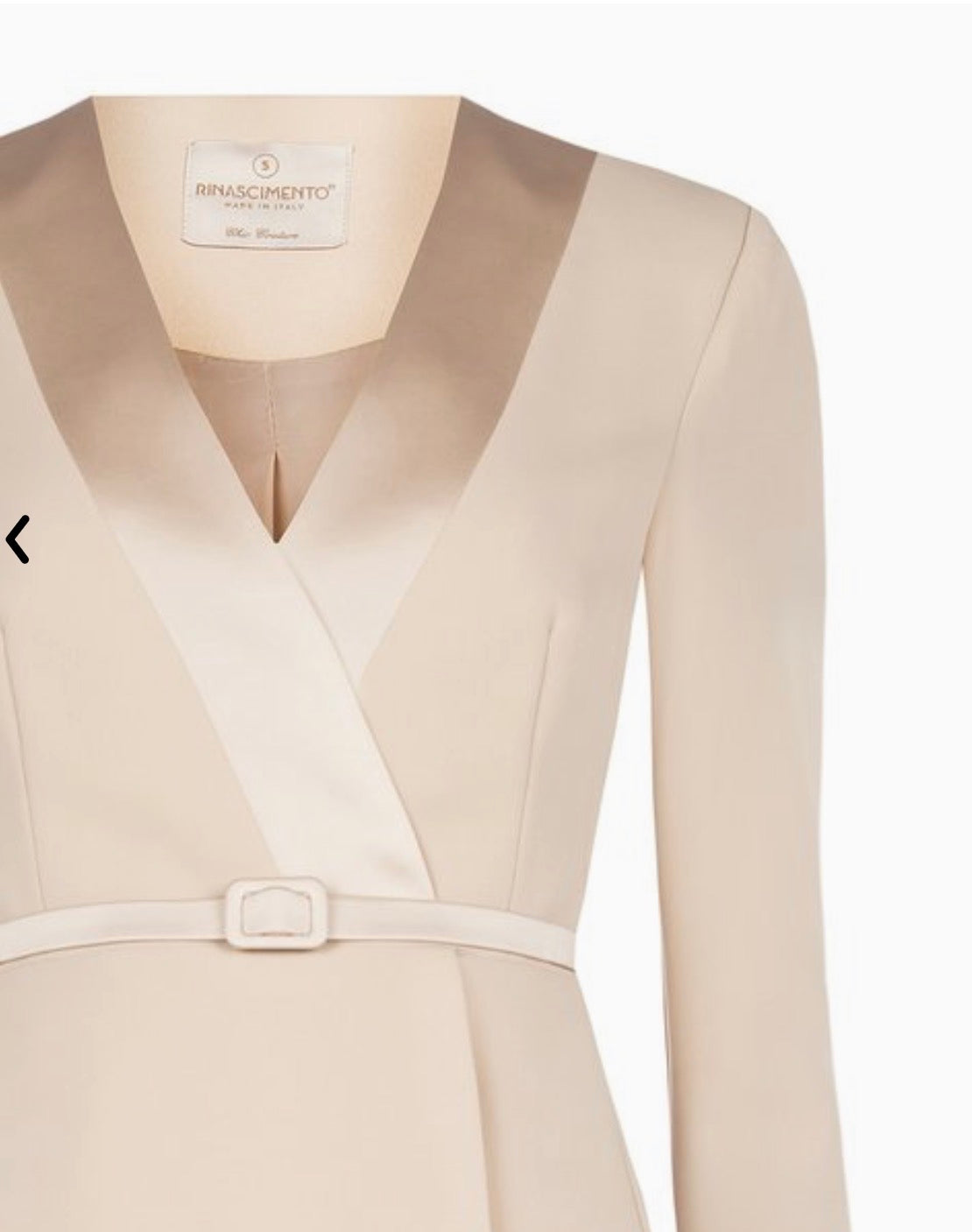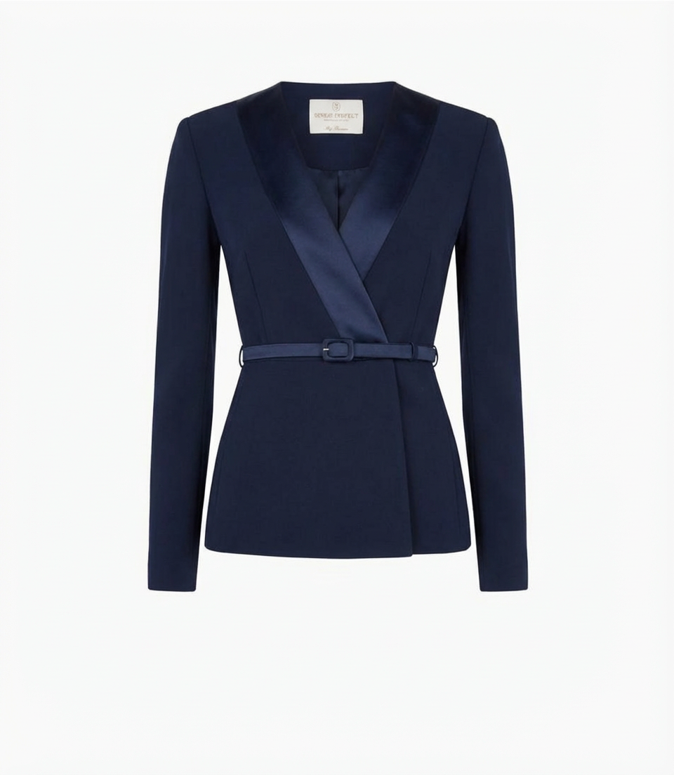 Giacca con scollo a V bordato in raso. Chiusura con bottoni automatici a scomparsa e cintina sottile in vita. Tessuto elasticizzato.