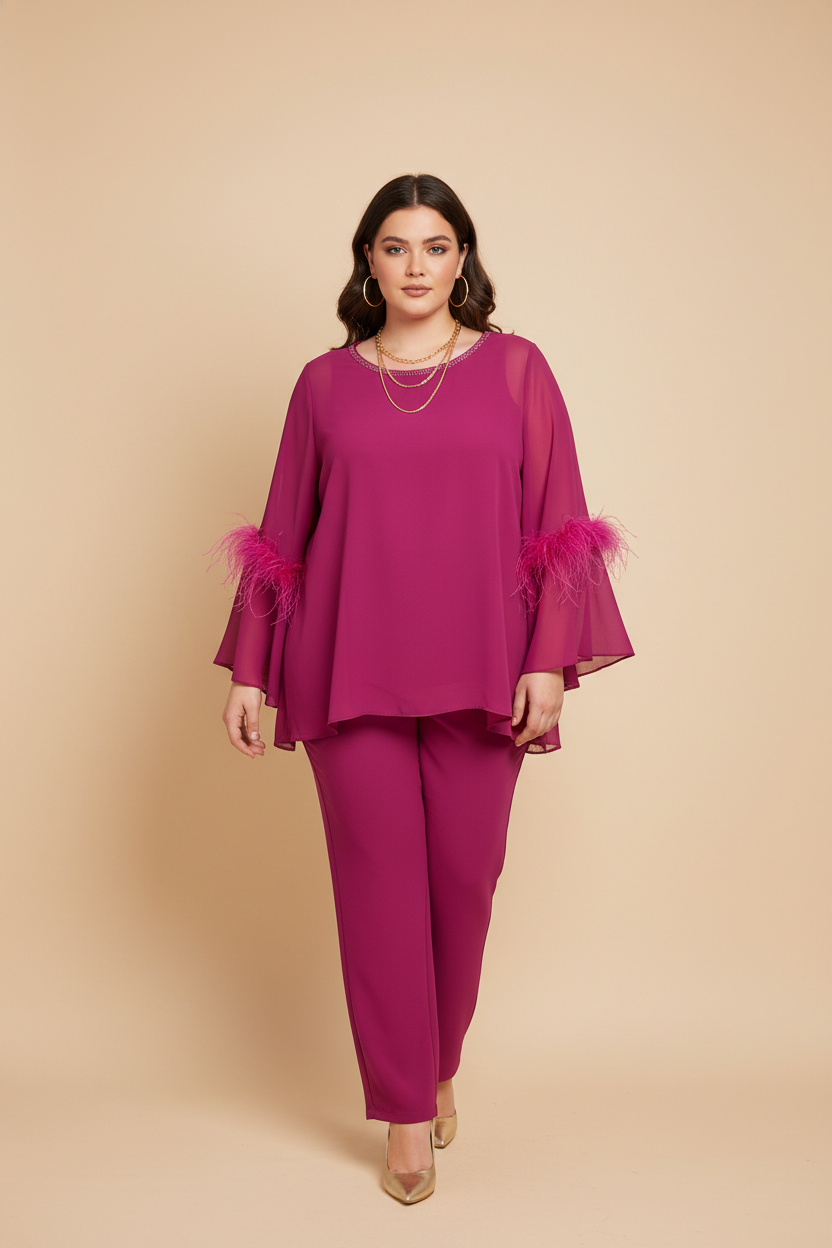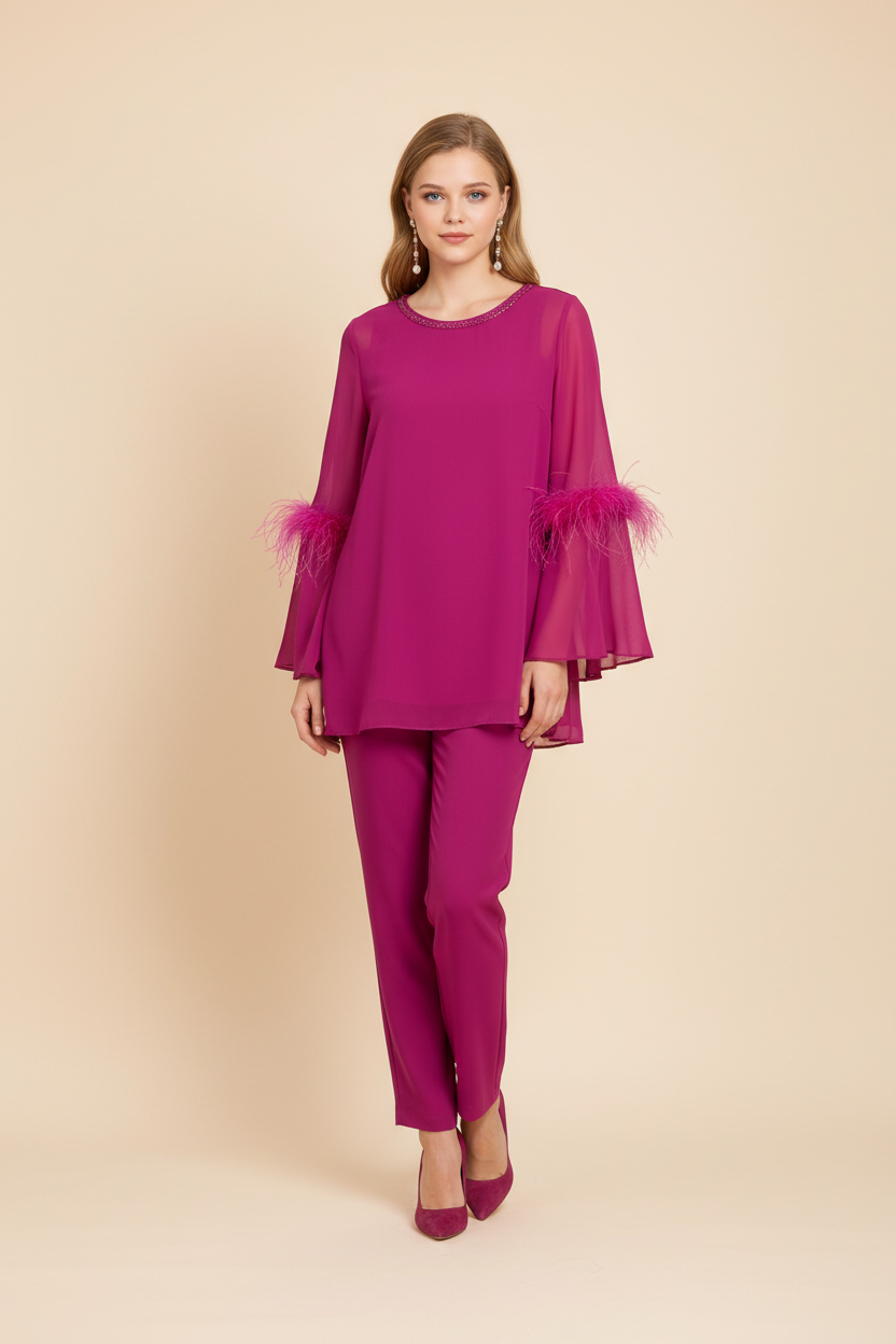 Maglia in georgette ampia con scollo tondo bordato in strass tono su tono, manica lunga in trasparenza svasata in fondo arricchita con piume.