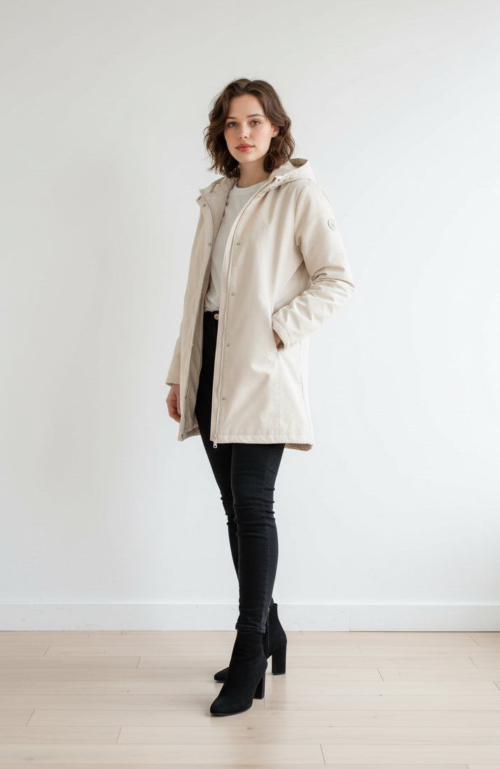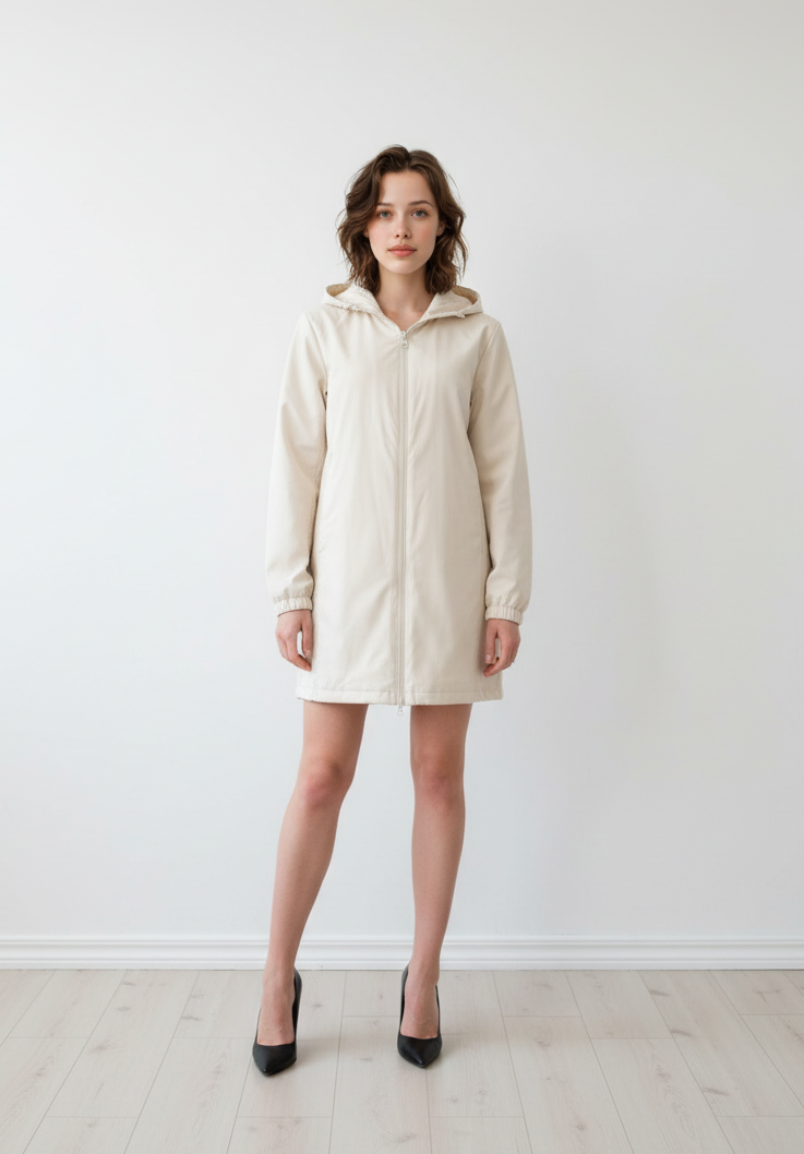 Da un lato è in tessuto tecnico impermeabile, dall’altro è un piumino trapuntato.