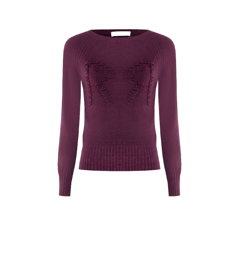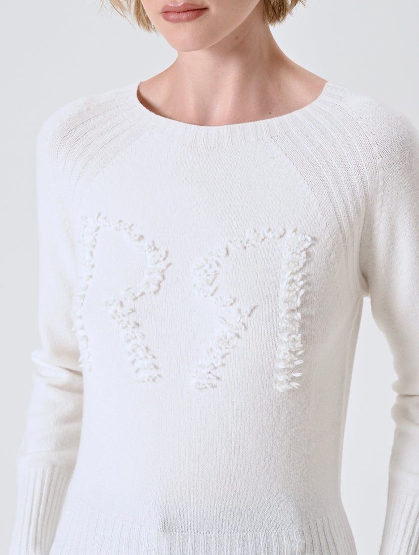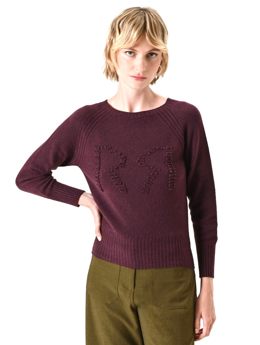 Maglione RR è in misto viscosa con lettere in rilievo effetto bouclé.