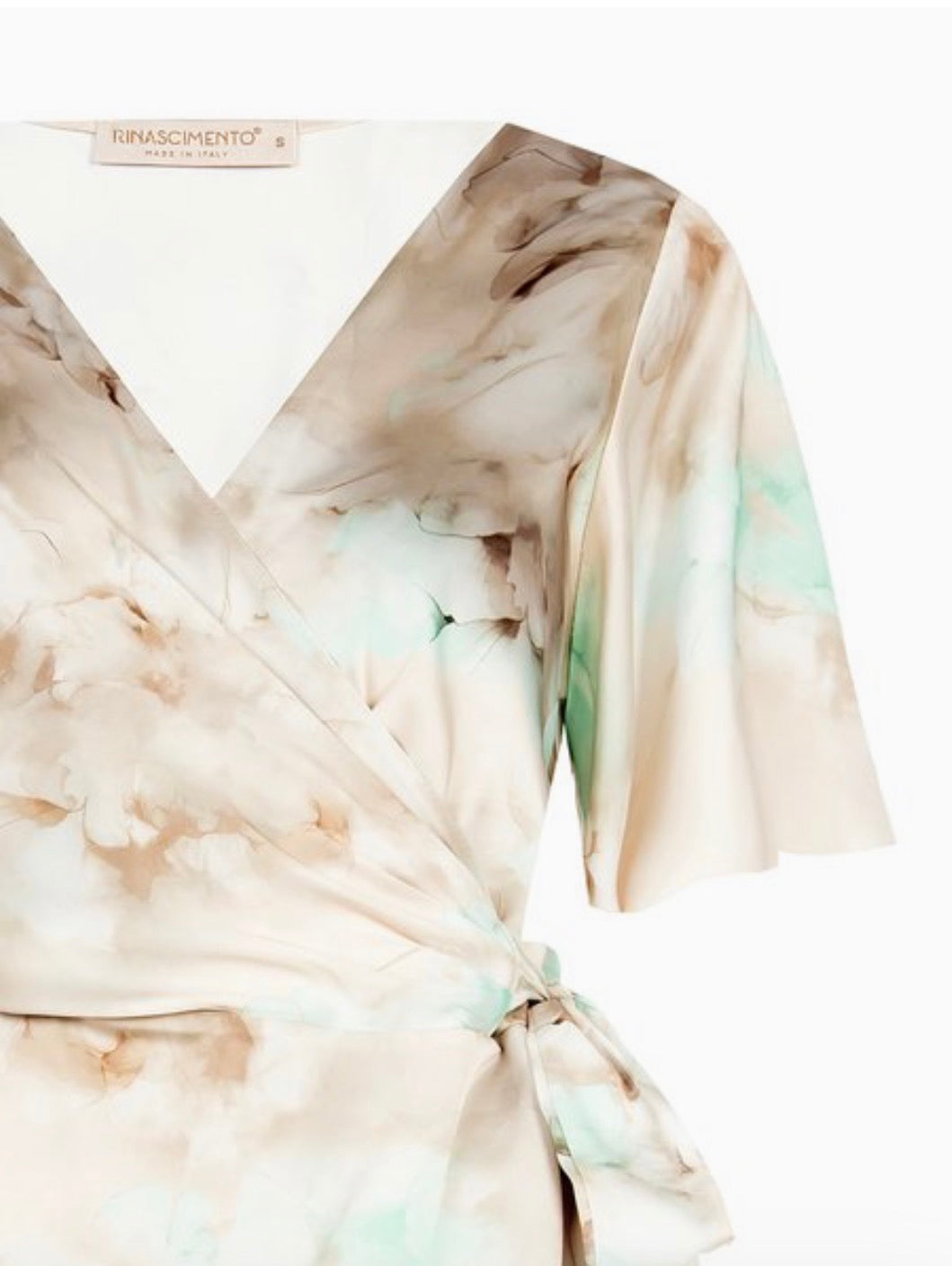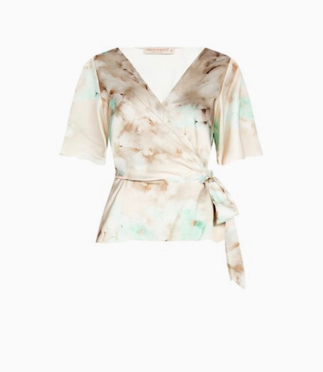 Blusa fantasia è una camicia a kimono con scollo a V e chiusura con cinta sul lato.