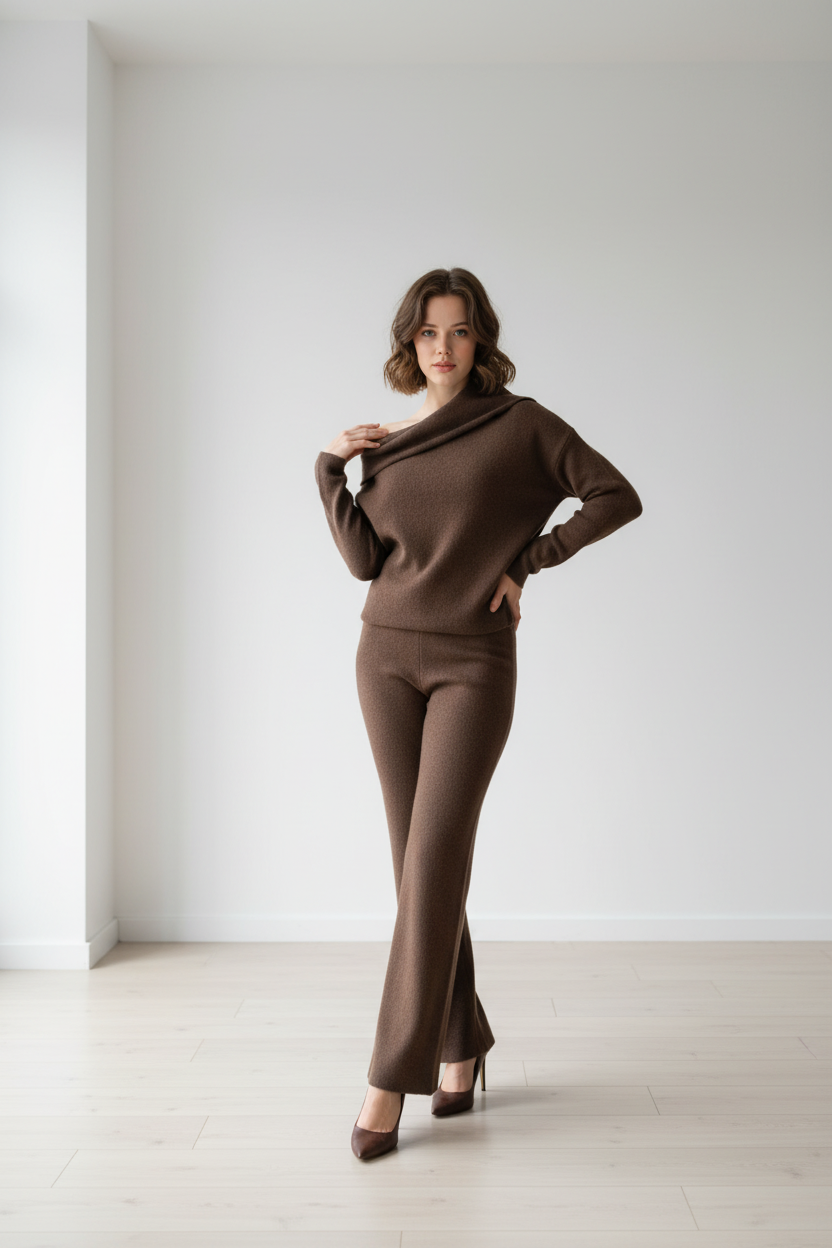 Pantalone ampio in maglia con vita alta risvoltabile.