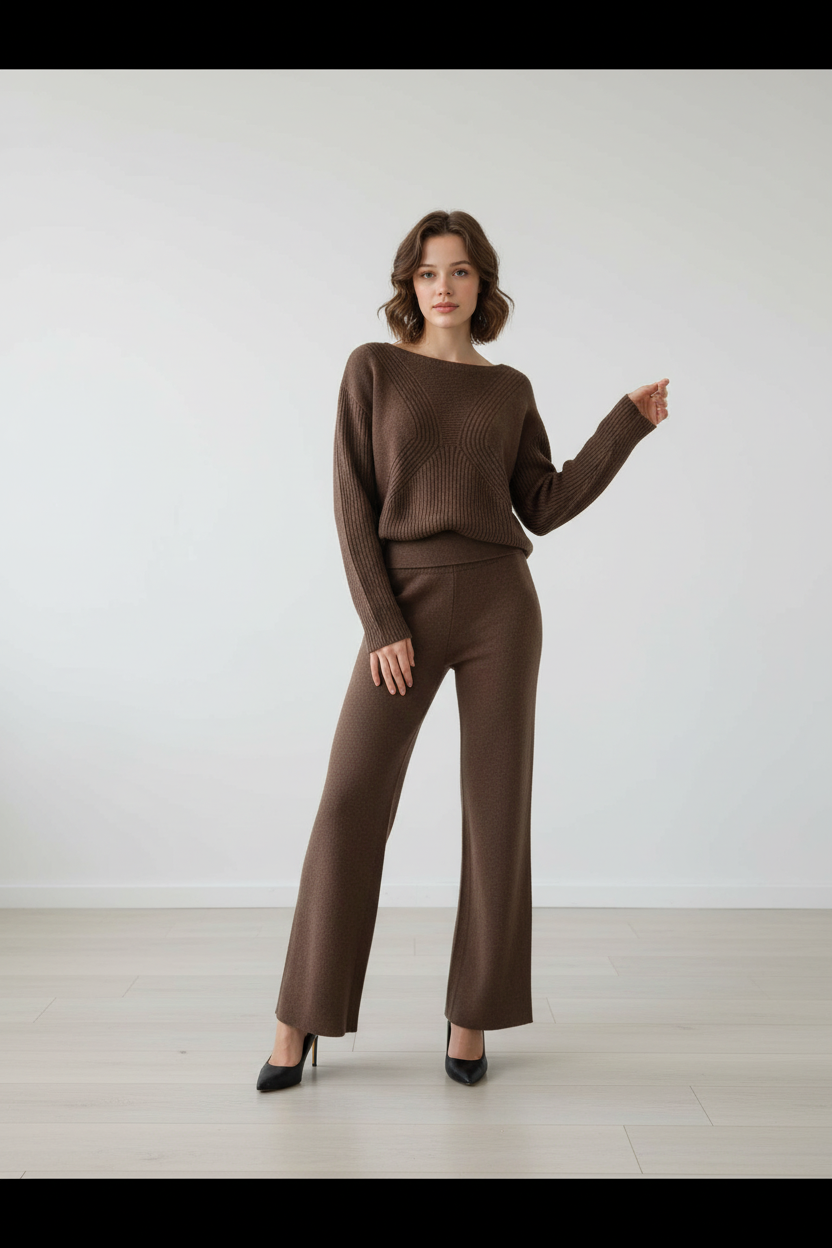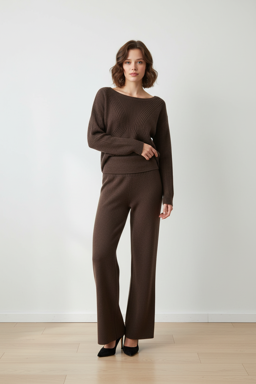 Pantalone ampio in maglia con fascia alta in vita risvoltabile.