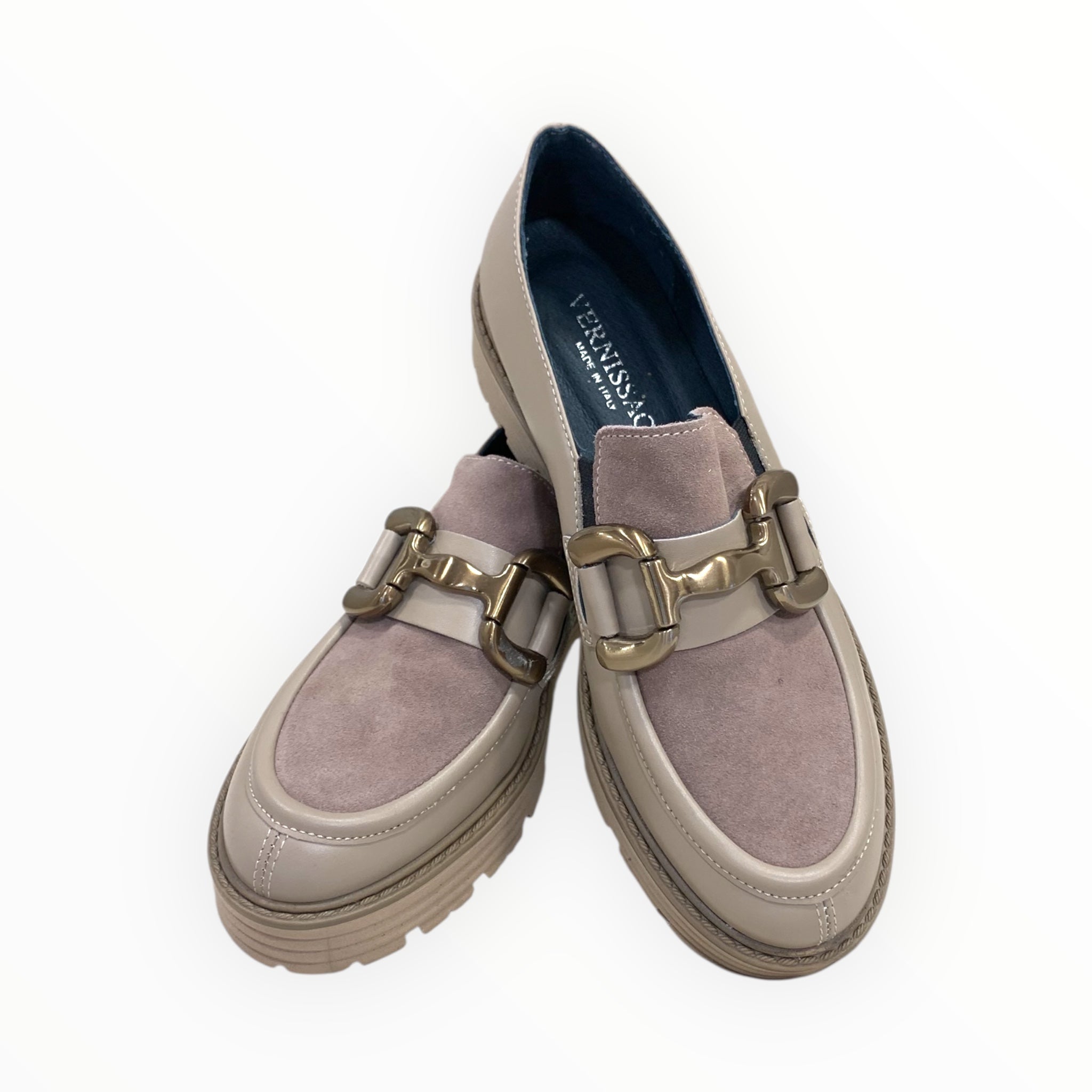 Mocassino pelle e camoscio con fibbia satinata.