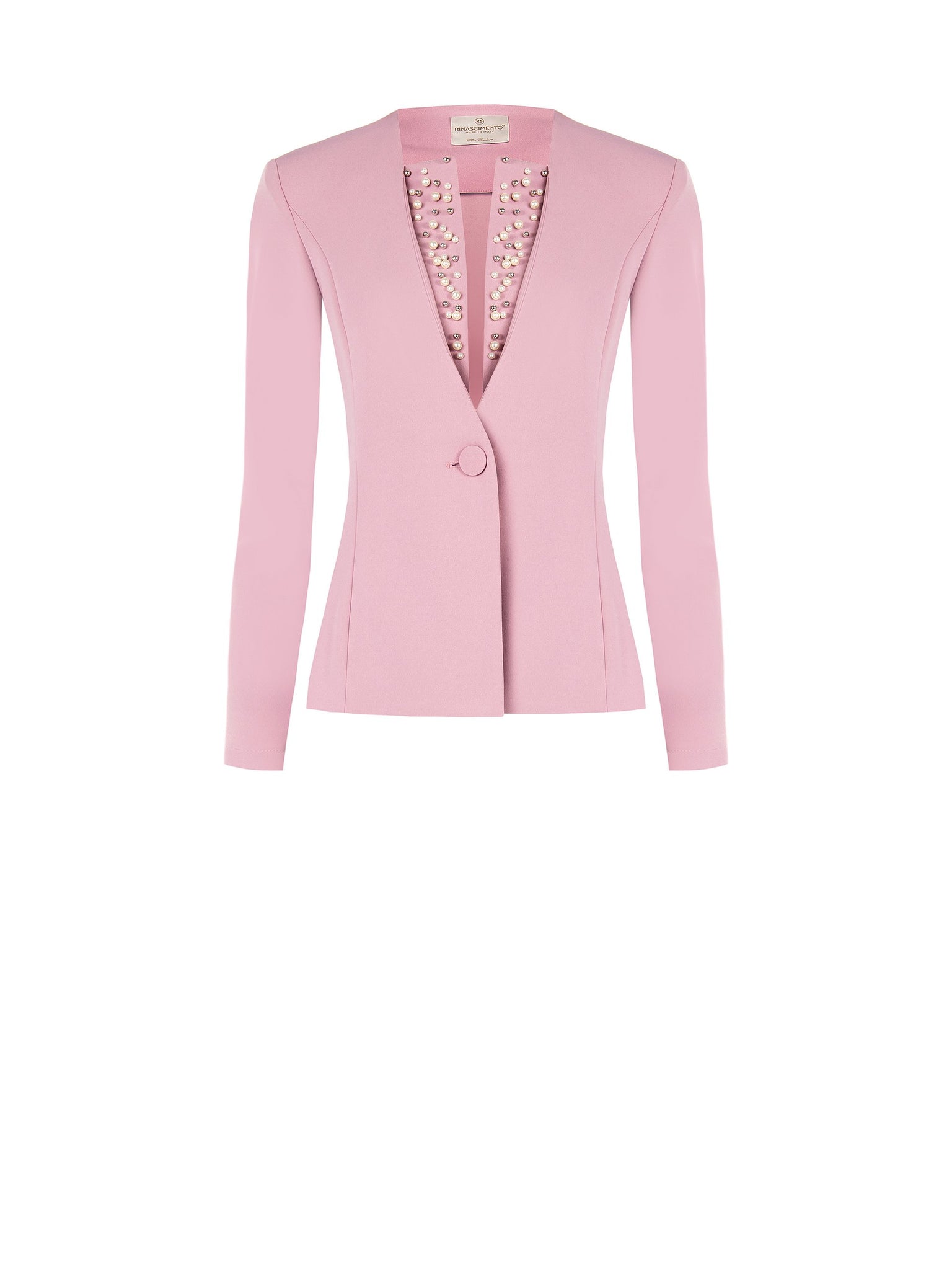 Giacca ad un bottone con collo sciallato impreziosito da perle ricamate. Modello avvitato.